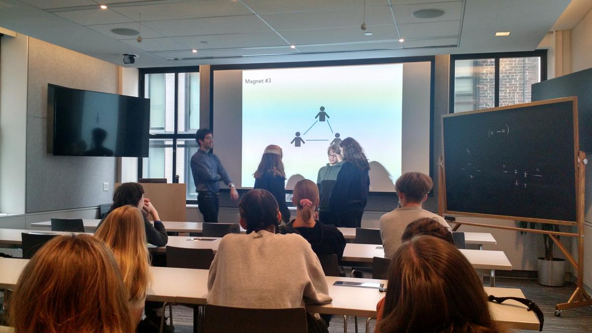 I was able to meet one of the presenters - Miles Stoudenmire, of the Flatiron Institute in New York City, enabling a visit to Flatiron during my class trip in May to New York City. During our visit to Flatiron, Miles gave my class a presentation on what they do at Flatiron, and how math, AI, and advanced software programming techniques are being used to expand our understanding of quantum physics. In the picture below some of my students are being led through an activity to demonstrate how electron spin patterns give rise to magnetism. Miles did a great job and our visit was very well received by both my students and my adult chaperones.